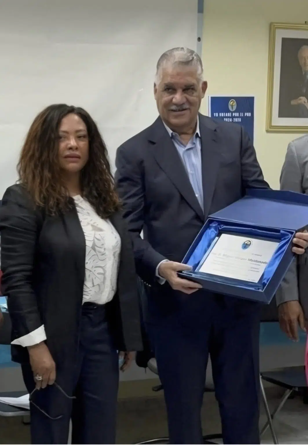 En el marco del desarrollo de la juramentación de la nueva Directiva del Partido Revolucionario Dominicano (PRD) Seccional Madrid. la presidenta de la seccional licenciada Súlgida Nin, entregó una placa de reconocimiento al Presidente de la organización política, ing. Miguel Vargas Maldonado, por su firme liderazgo,